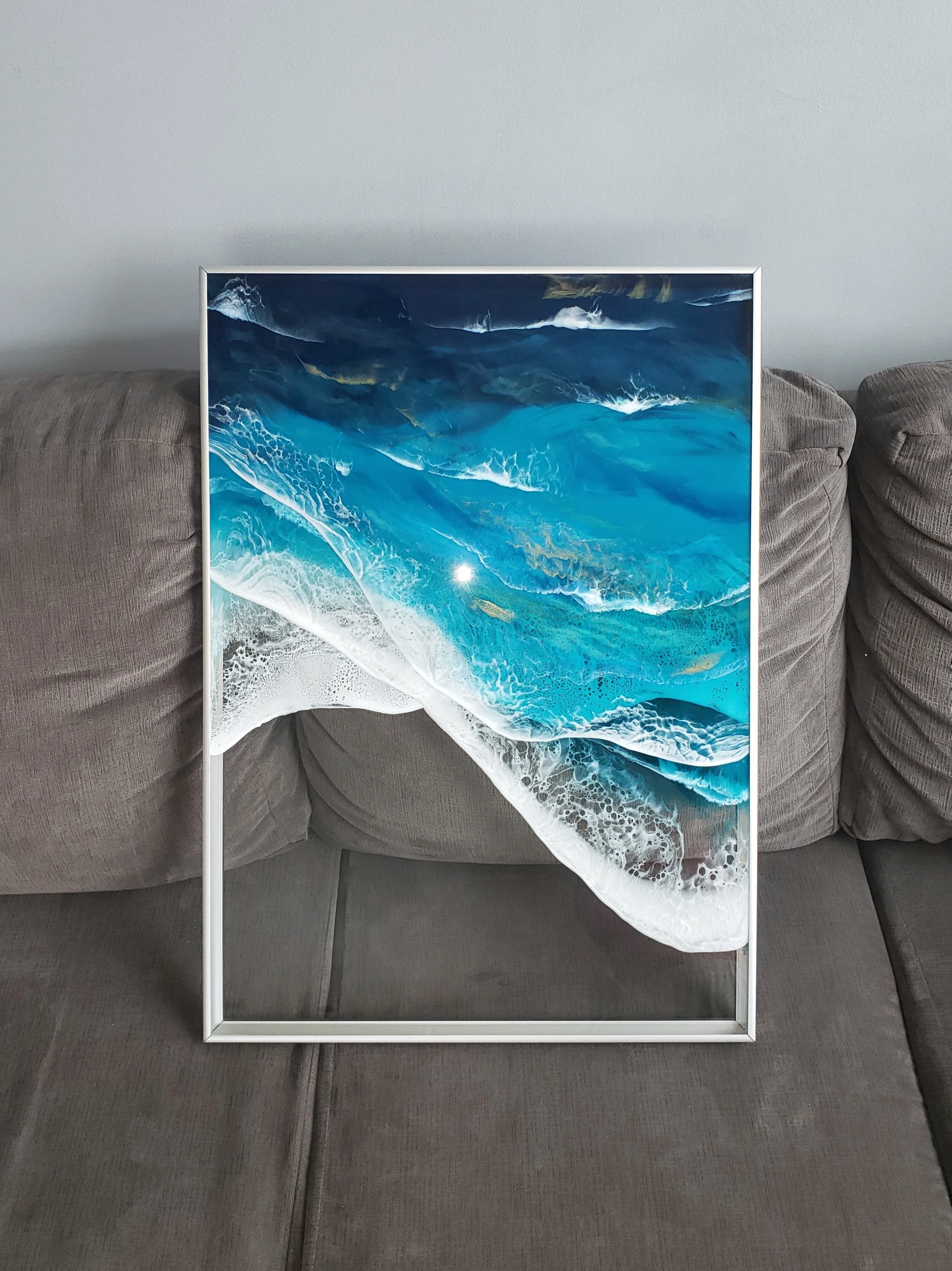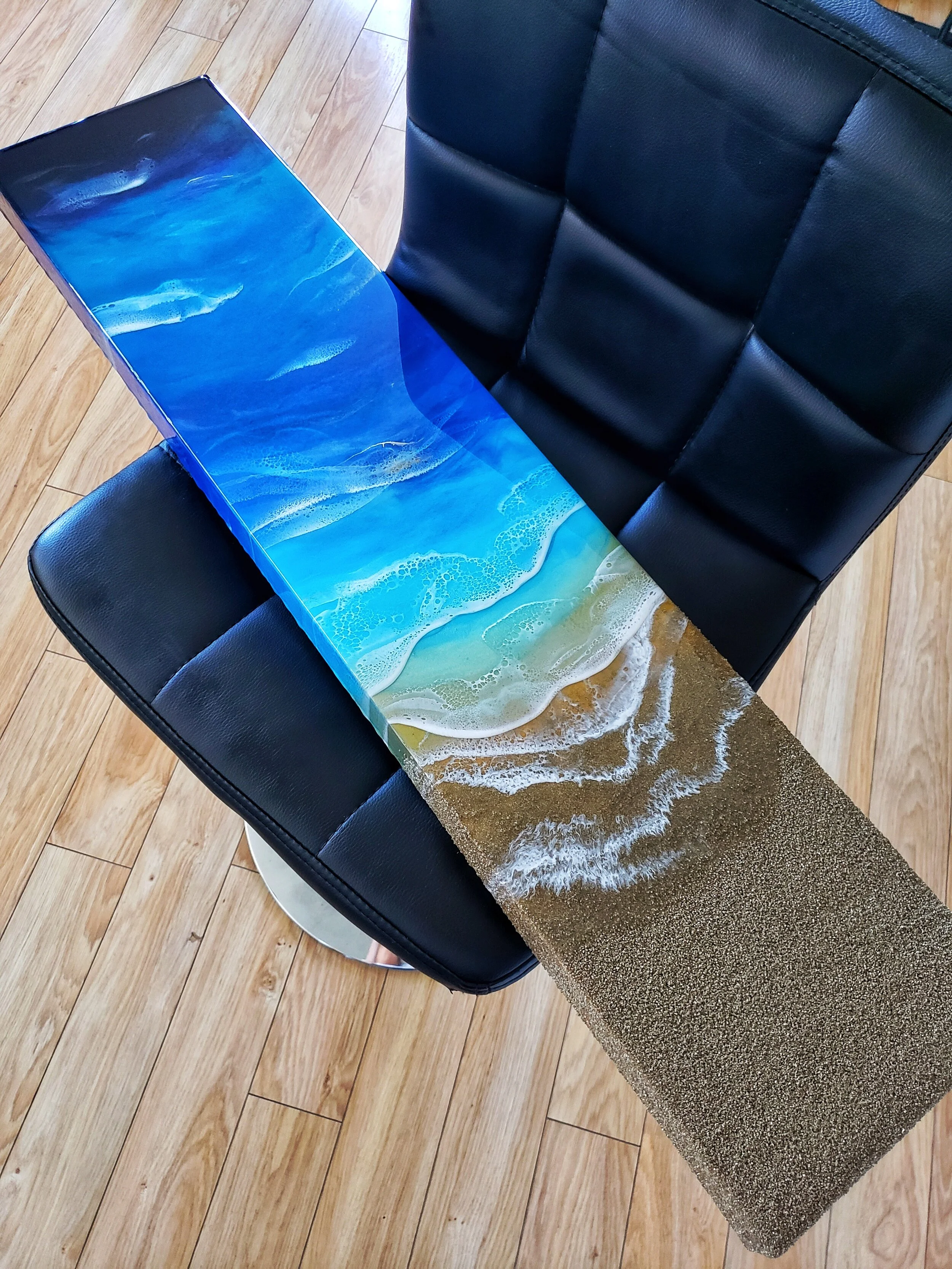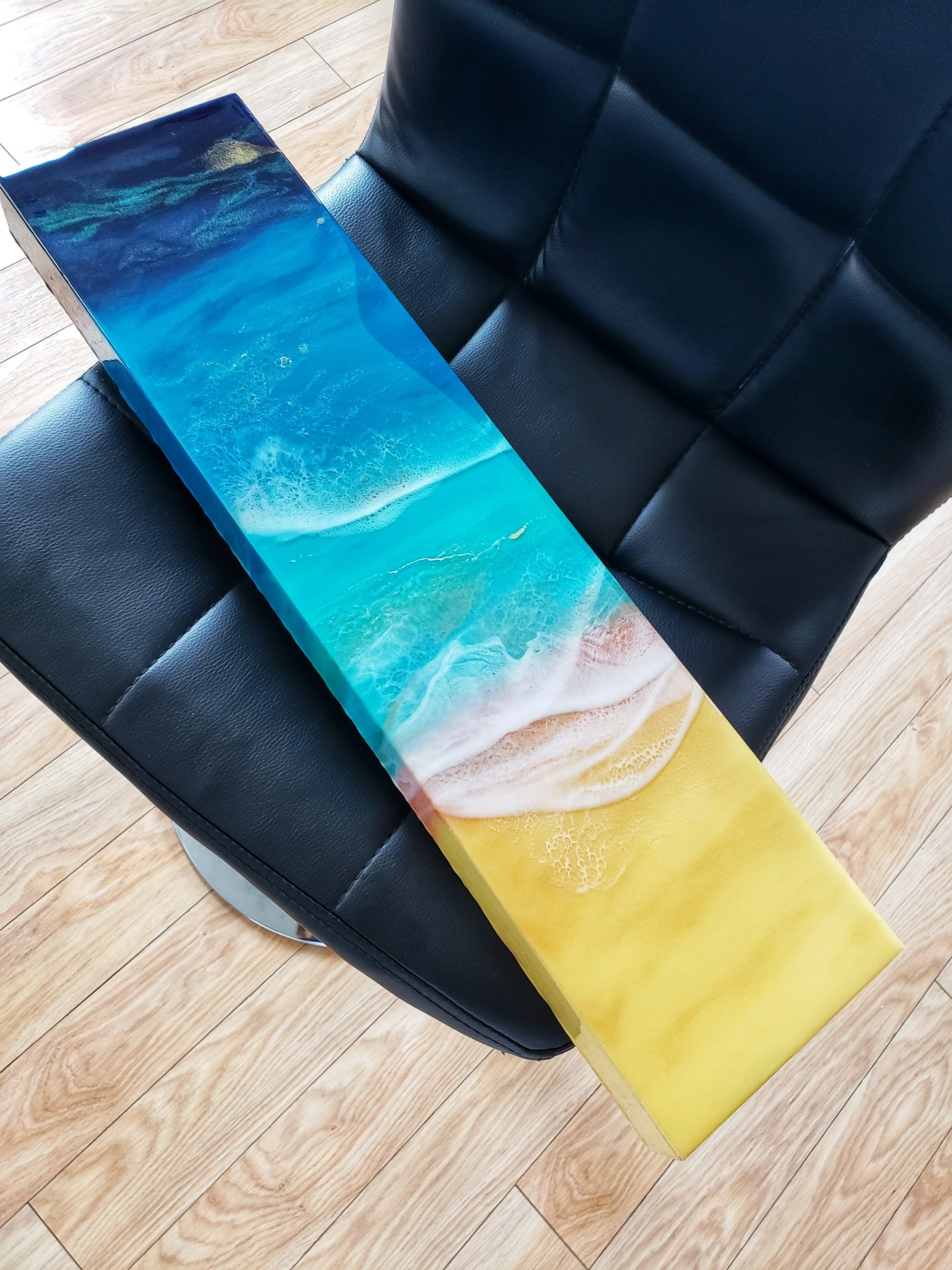 3D epoxy resin ocean art on natural wood slab 24” x 11”