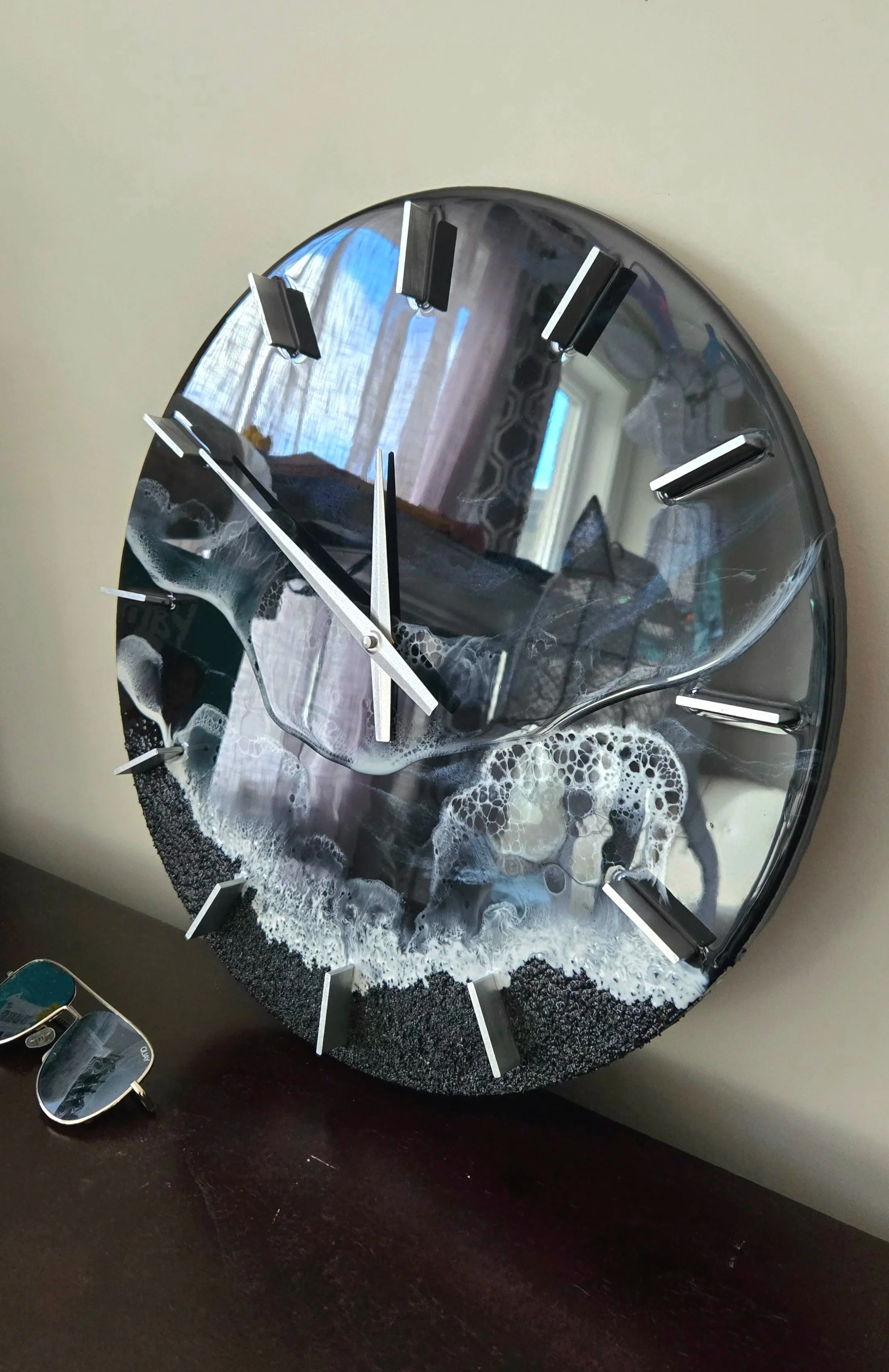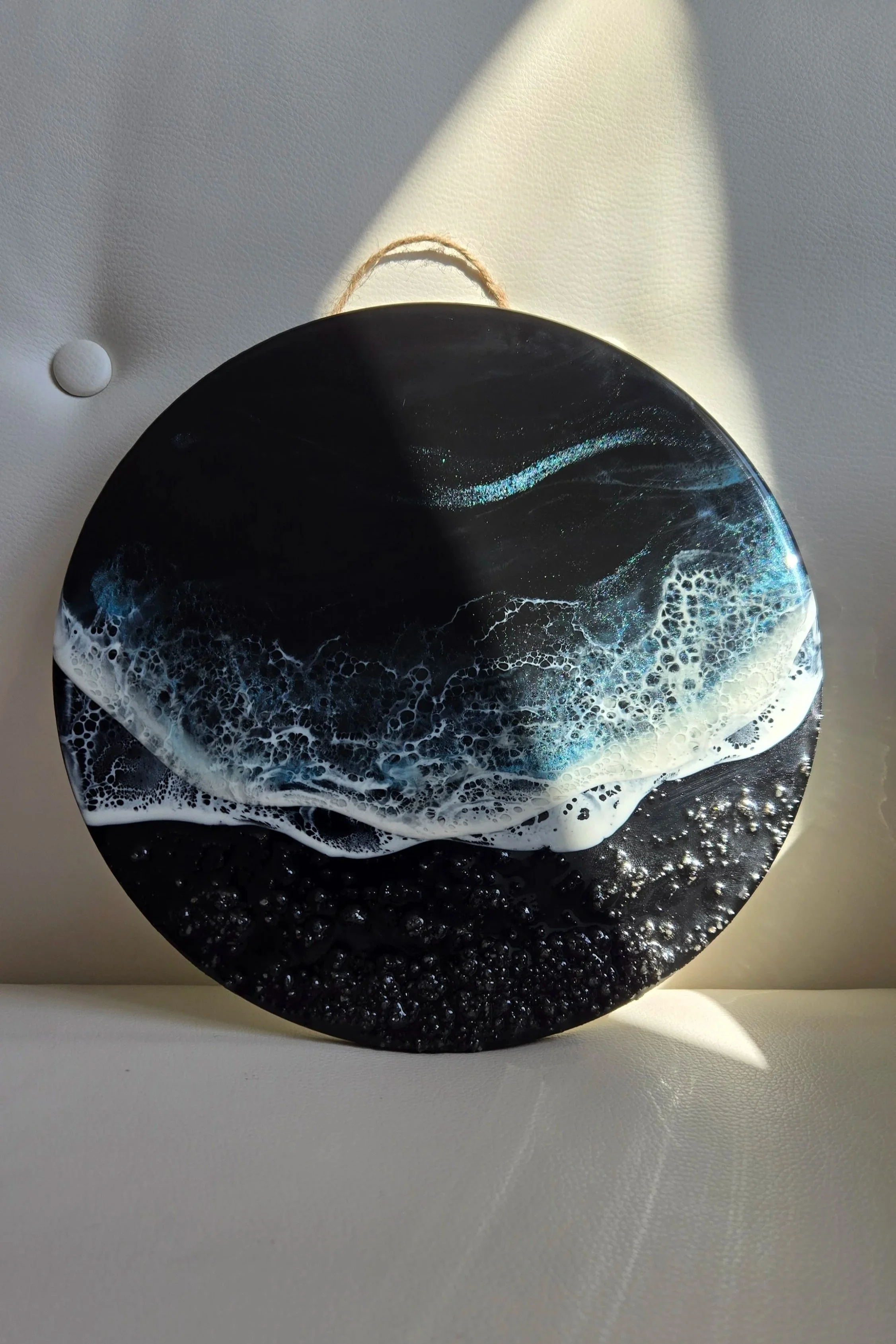 Large 3D epoxy resin ocean with black sand on wood panel