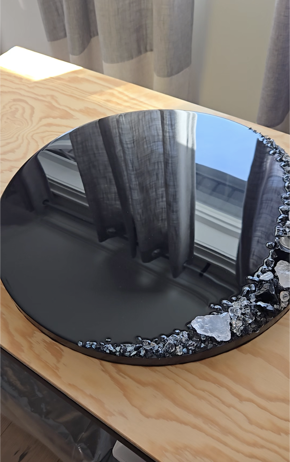 Epoxy resin on round panel with genuine quartz and other natural stones